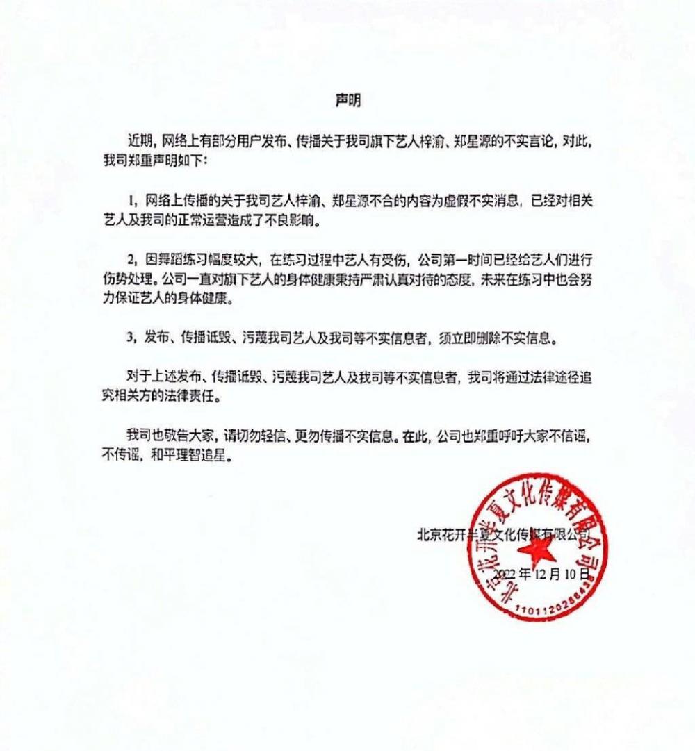 晚间,经纪公司发声明回应,称网传两位成员不合为不实言论,因舞蹈练习幅度较大,艺人在练舞过程中受伤已进行伤势处理,并呼吁大家不信谣,不传谣,理智追星。