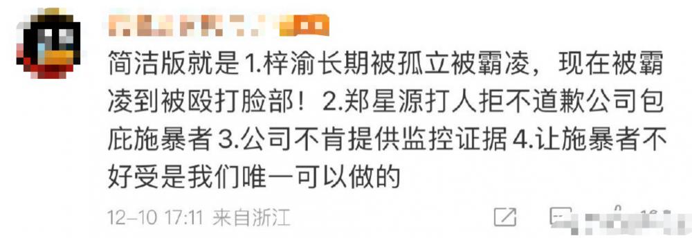 搜狐娱乐消息,12月10日,有粉丝发长文曝光合少年成员梓渝疑似被队友霸凌殴打,引发热议。随后,梓渝后援会发文称已联系公司,公司称是练舞时受伤,后援会再次追问但未得到明确回复。