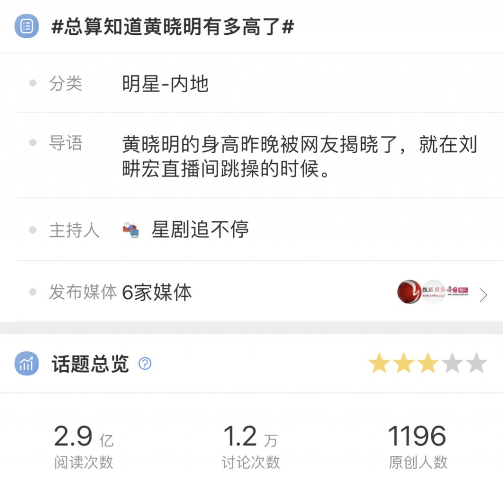 # 总算知道黄晓明有多高了 # 这个话题,在微博被围观了 3 亿次。
