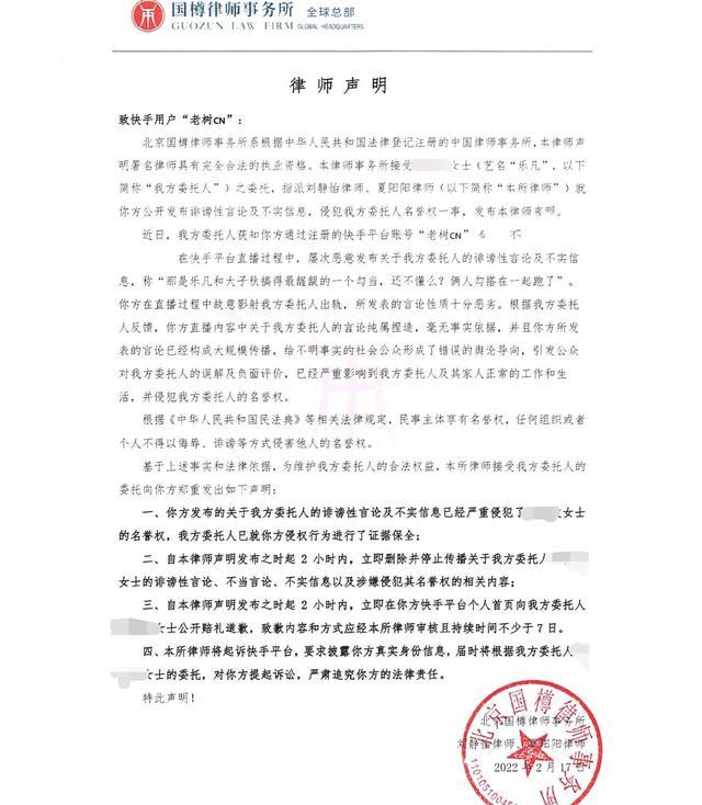乐凡在这份律师函中否认了自己有出轨的行为,而且她还要求造谣者“老树”公开在自己的账号上发布道歉视频,并且道歉视频必须七天之内不能删除。