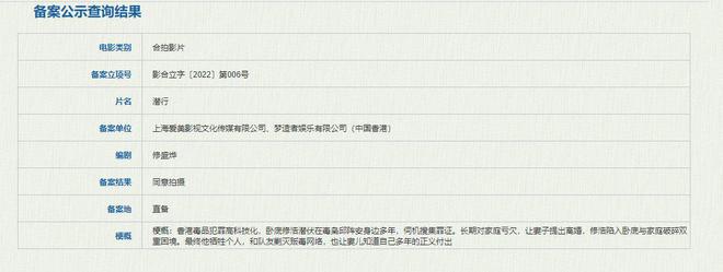 据国家电影局 2022 年 4 月全国电影剧本 ( 梗概 ) 备案、立项公示,电影《潜行》正式立项,编剧为修盛烨。出品公司为上海爱美影视文化传媒有限公司、刘德华旗下的梦造者娱乐有限公司(中国香港)。电影已经正式立项,上月中开机,预计会在七月末杀青。