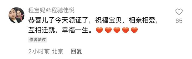 刘程结婚的喜讯曝光后,他的妈妈立刻在评论中留言发文祝福。