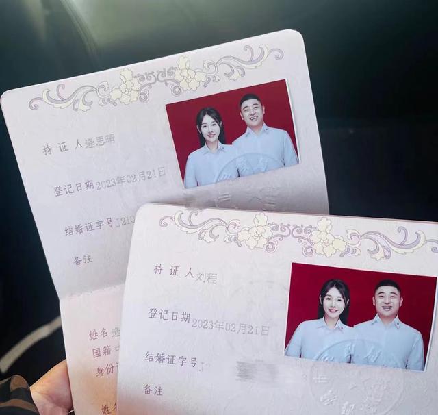 而登记照中,小两口都穿着白色情侣装。不知道是不是因为人逢喜事精神爽,刘程不仅笑得合不拢嘴,整个人还圆润了一圈,显得更加壮实。