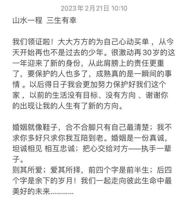 誓言中,刘程还开心地写到,很激动在 30 岁这一年迎来新的身份,未来他的责任更重,要保护的人更多,他很感谢妻子的出现让他的人生有了新的方向。看得出来,他对妻子的感情十分深厚,很激动能够迎娶对方。