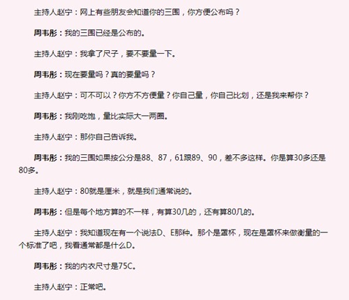 在某新浪访谈中,周韦彤就曾自爆自己的三围是88/61/90cm. 身材对于女星来说其实也是一面双刃剑,有好的身材观众缘好,也比较容易有知名度和曝光率,但若是长期以往,等到女星真正成名以后又无法摆脱掉靠胸上位的名头。在这个走秀甚至拍戏,都是以露博眼球,甚至会没有观众去关注有没有演技,就直接认定你就是花瓶,很难让别人看到自己其他的好处。