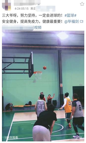 4月24日,有网友在社交平台上曝光了一组毕福剑的视频。61岁的毕福剑一身篮球服秒变投球小能手,和一群年轻小伙PK篮球。