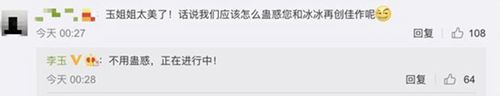 很明显范冰冰与李宇春的关系并不是像网上谣传的那样只是很好的闺蜜关系罢了,近日有好奇的网友在大导演李玉的微博中留言评论什么时候能够与范冰冰再度合作,而李玉也是大方的回复道:正在进行中。很多网友都知道李玉与范冰冰曾合作过《观音山》《二次曝光》《万物生长》等作品,两人可以说是非常好的搭档了,李玉的这番话也是引起了很多人的关注,范冰冰这一次真的要复出了