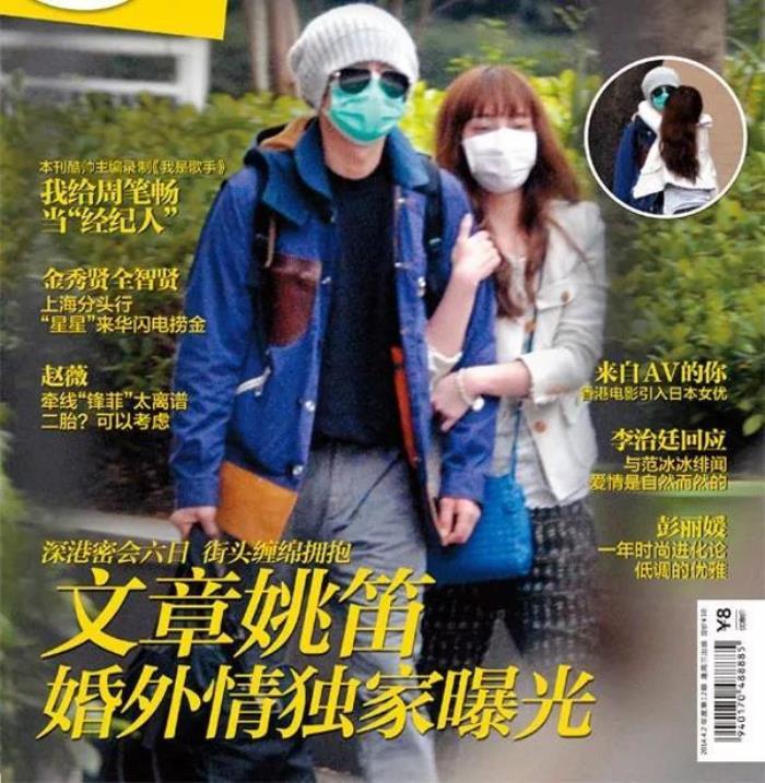 2014年3月,文章和姚笛戴着口罩在深圳的某小区搂抱着接吻被拍到,同样很甜蜜,也是同样炸开了锅。