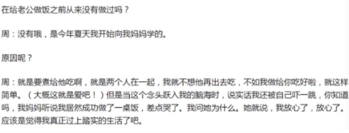 周迅接受访谈时,还说她妈妈曾经劝过她、觉得周迅不一定非要结婚,而且也一直不让她进厨房。