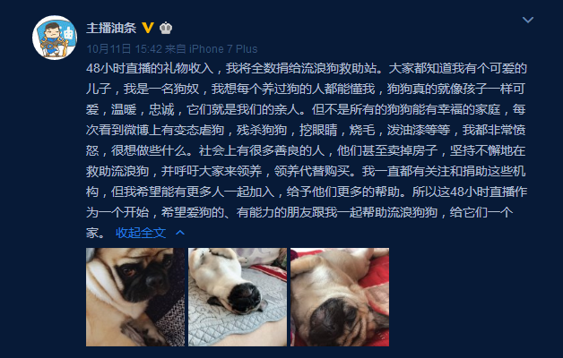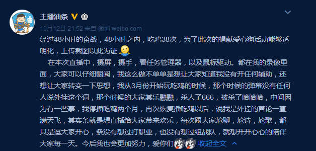 10月10号那天,主播油条发微博表示,要连续直播48小时,吃鸡30把,48小时直播的礼物收入将全部捐给流浪狗救助站。