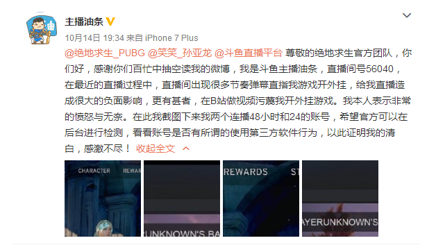 10月14号,主播油条终于发声了,直接喊话绝地求生官方,截图自己的吃鸡直播账号,希望官方后台检测,证明自己的清白。