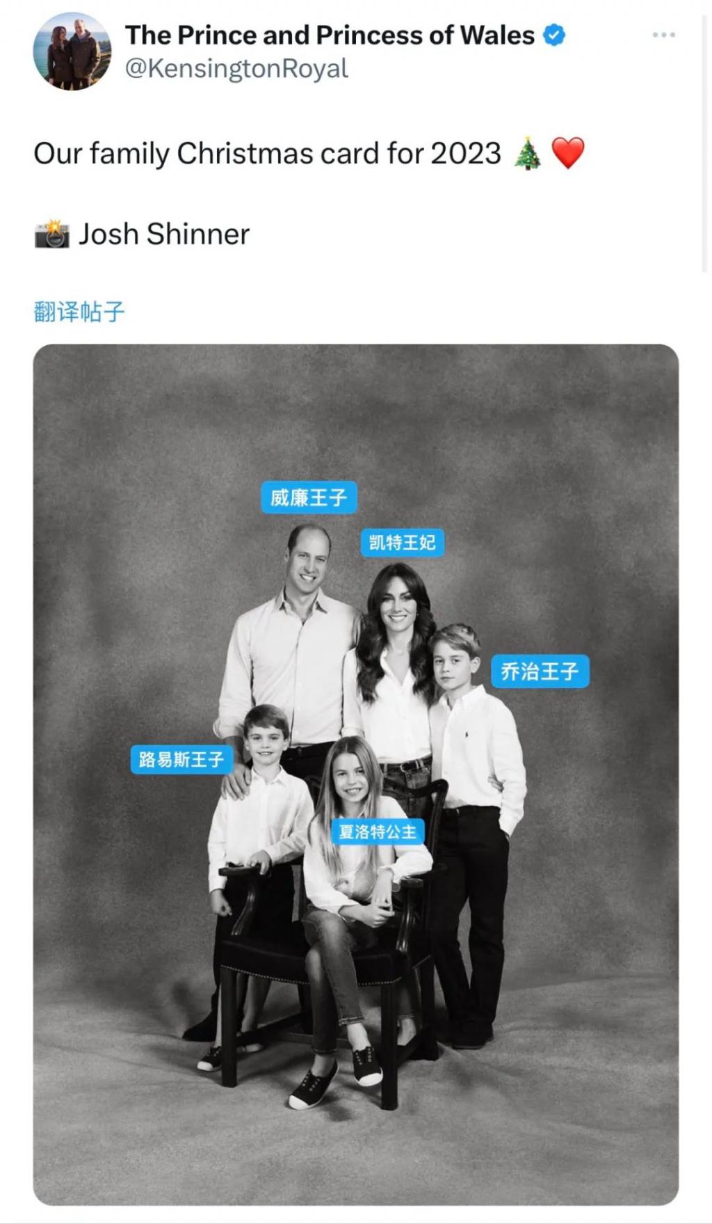 不久前,威廉王子和凯特王妃的官方账号发了一家人 2023 年圣诞贺卡