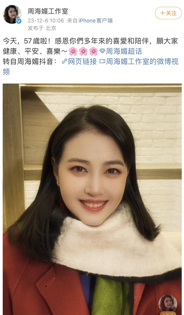12月12日,周海媚工作室发表声明,周海媚于2023年12月11日因病医治无效,在北京去世,享年57岁。