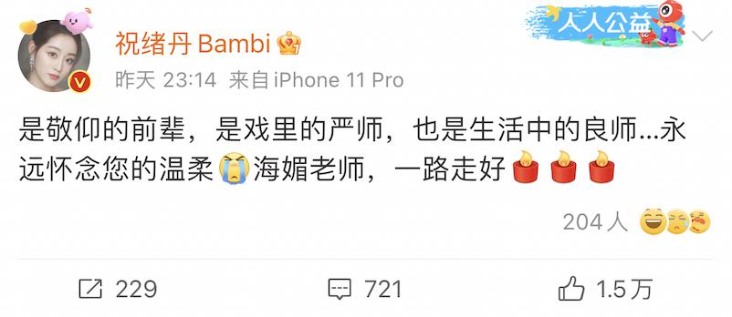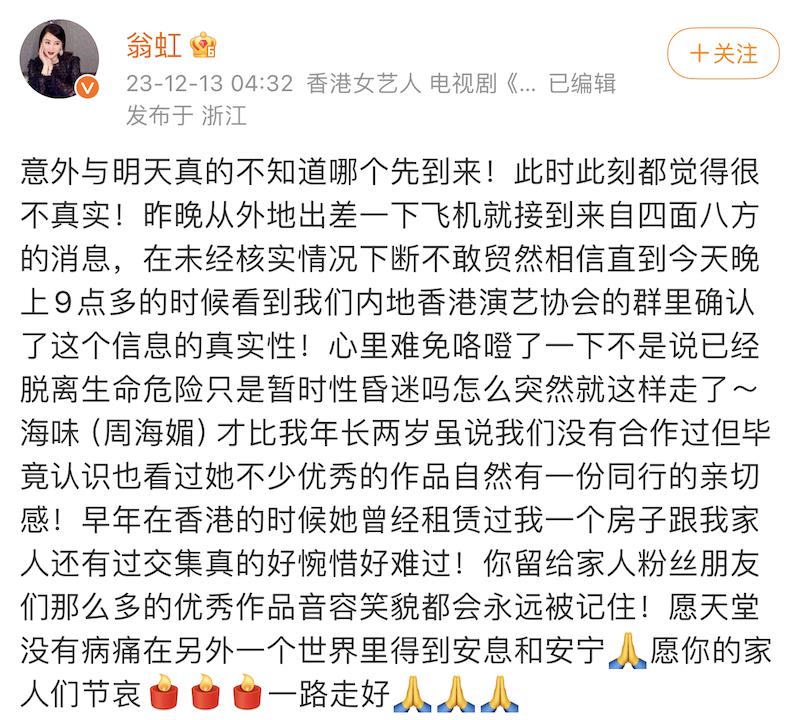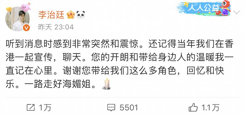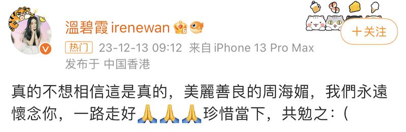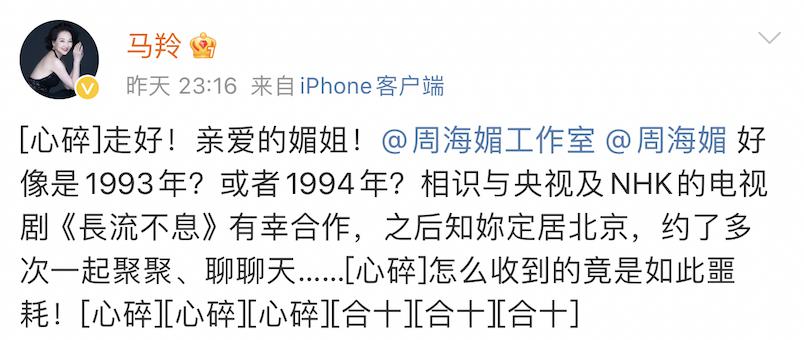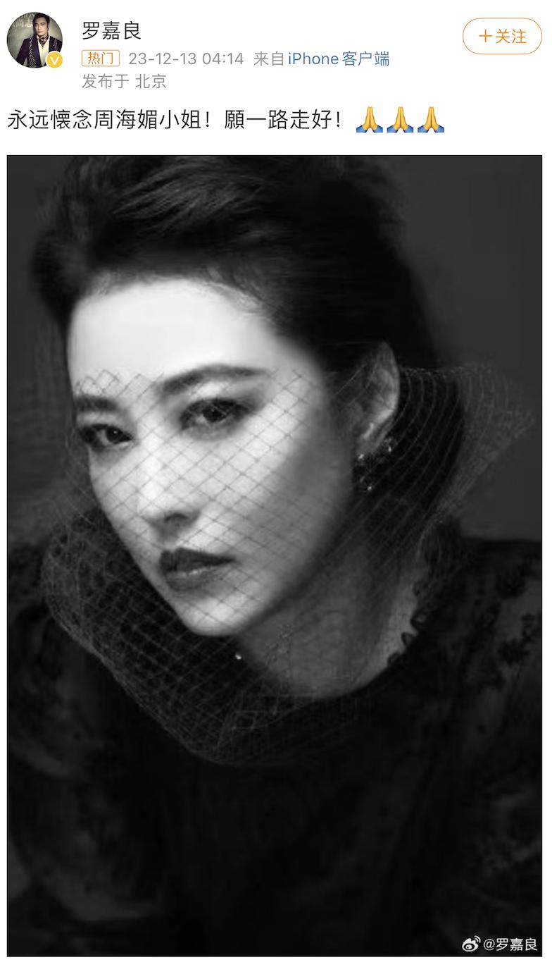 周海媚在2002年定居北京,在内地娱乐圈里工作了二十年,也有不少内地或台湾明星发文悼念,多是与她有过合作的演员。