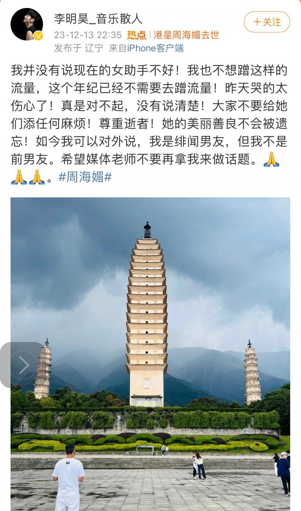 周海媚去世之后,他哭着在抖音指责有人照顾不周,但很快就删了,然后发了一条澄清声明,上面说,自己是周海媚的绯闻男友,但不是前男友。