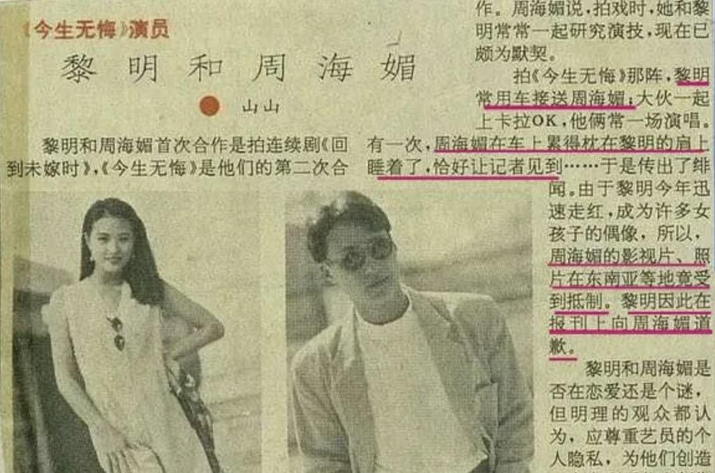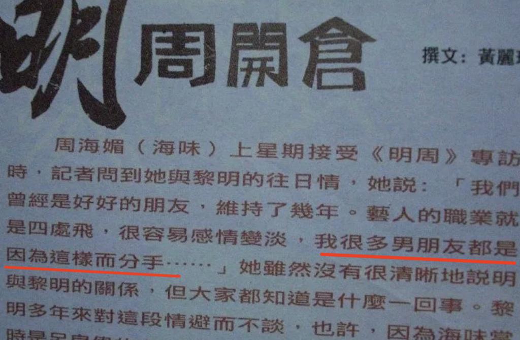 周海媚和黎明的绯闻,以及他们分别和吕良伟、李嘉欣、舒淇等人的发展出的多角关系,曾经是香港娱乐八卦杂志最为活色生香的话题,养活了近十年的娱乐版面。二人真真假假的传闻传了许多年,在坊间,粉丝们常常为其赋予各种唯美的想象和考据。