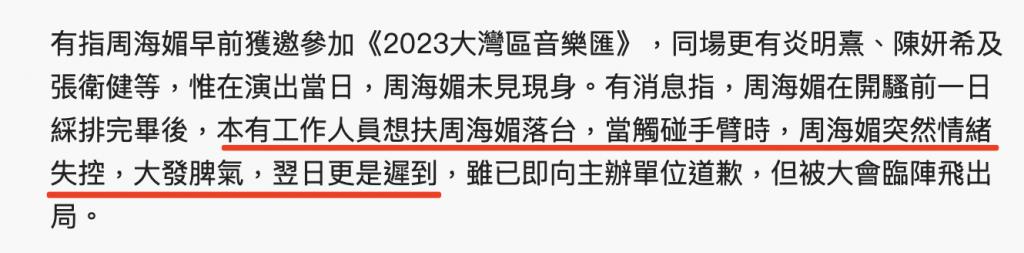 又传2023年大湾区晚会,本来有她的节目,但媒体报道周海媚彩排时情绪失控,大发脾气,遗憾错失了演出。