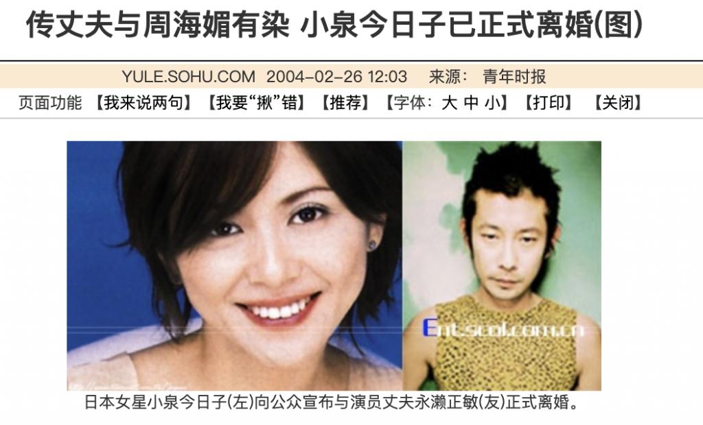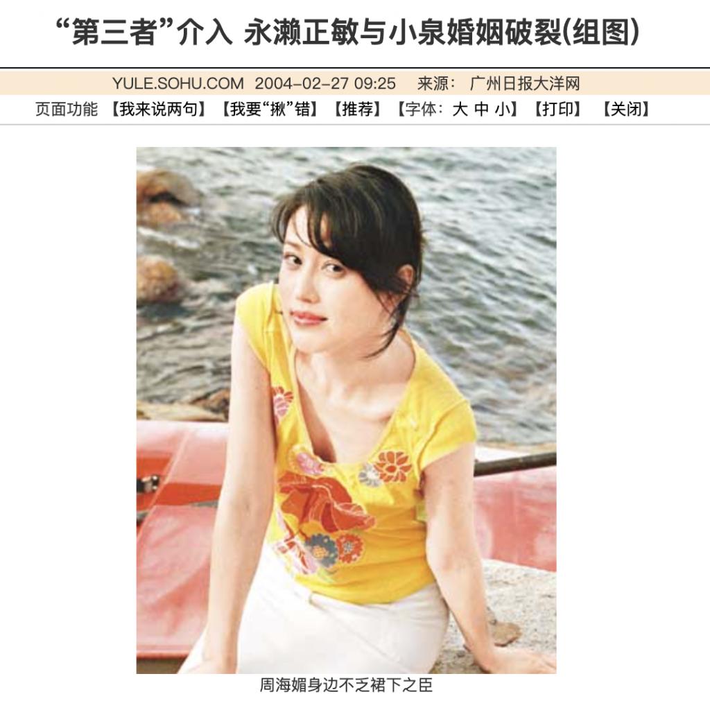 几年之后,永濑正敏和妻子离婚(离婚前他们一直以模范夫妻的形象出现),周海媚被指为第三者,轰轰烈烈的离婚消息传到香港,让周海媚的口碑极速跌落。