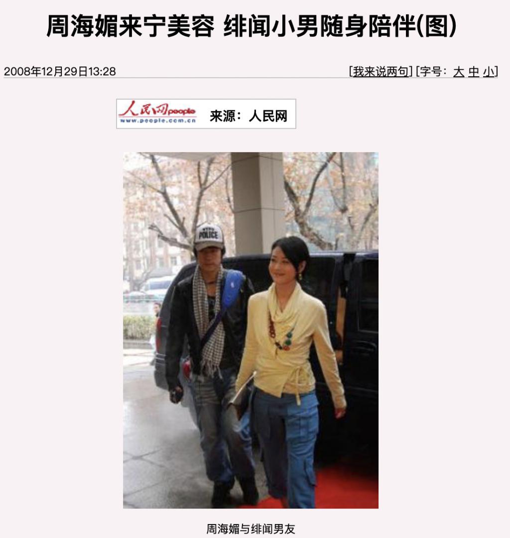 2002年到北京之后,周海媚便渐渐地离开了最烈火烹油的娱乐八卦头条,她还是在工作,在演戏,也有诸多恋情,但由于这些绯闻男友们大都来路不明,内地的娱乐记者也显然不如香港记者那么神通广大,草草几笔带过,人们不清楚她到底在和谁恋爱。