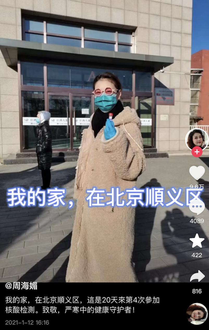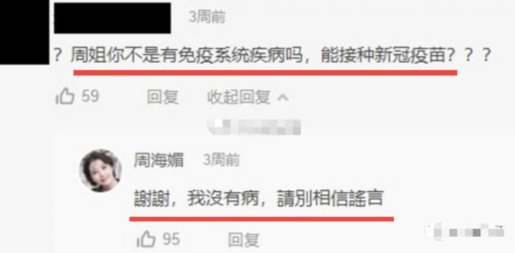 新冠期间,她接种疫苗,网友关心她生病能否接种疫苗,周海媚回复"我没病"。