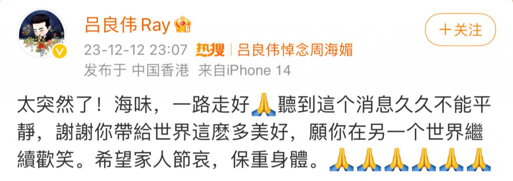很多明星在微博上表达了怀念,最先发声的是周海媚的"前夫"吕良伟(事实上二人并没有法律婚姻关系),他称呼她为"海味",这个曾经很亲切现在很遥远的昵称,很多年轻人并不知其中缘由,指责他竟然打错了名字。吕良伟说"谢谢你带给世界这么多美好"。