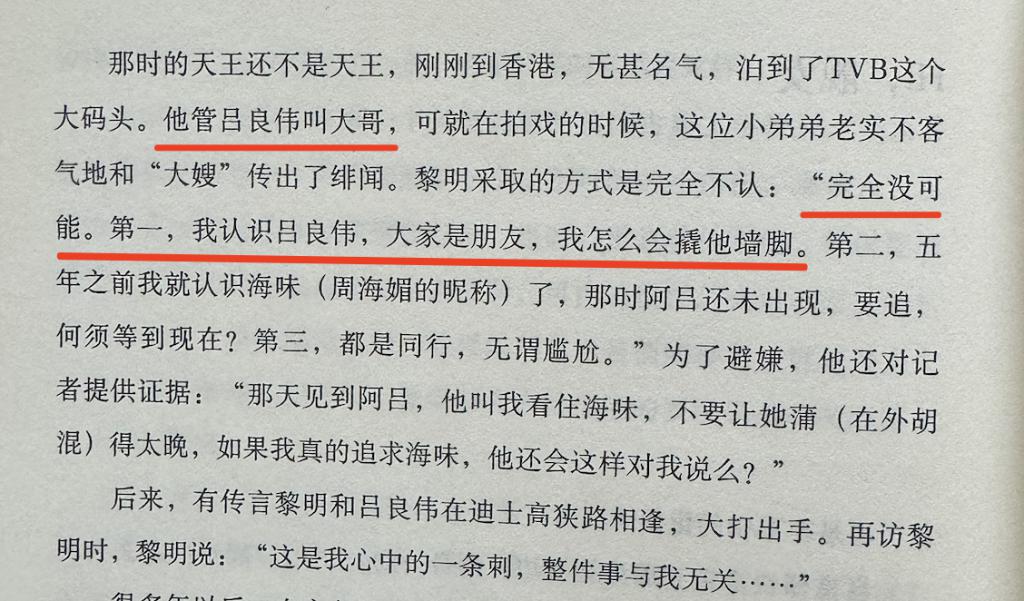 也有人说过吕良伟和黎明为争夺周海媚大打出手,但多年后吕良伟接受《志云饭局》采访时否认了动手,但并没有否认黎明横刀夺爱的事,"如果她认为开心,就做吧,我们男人,老实讲,输得起"。