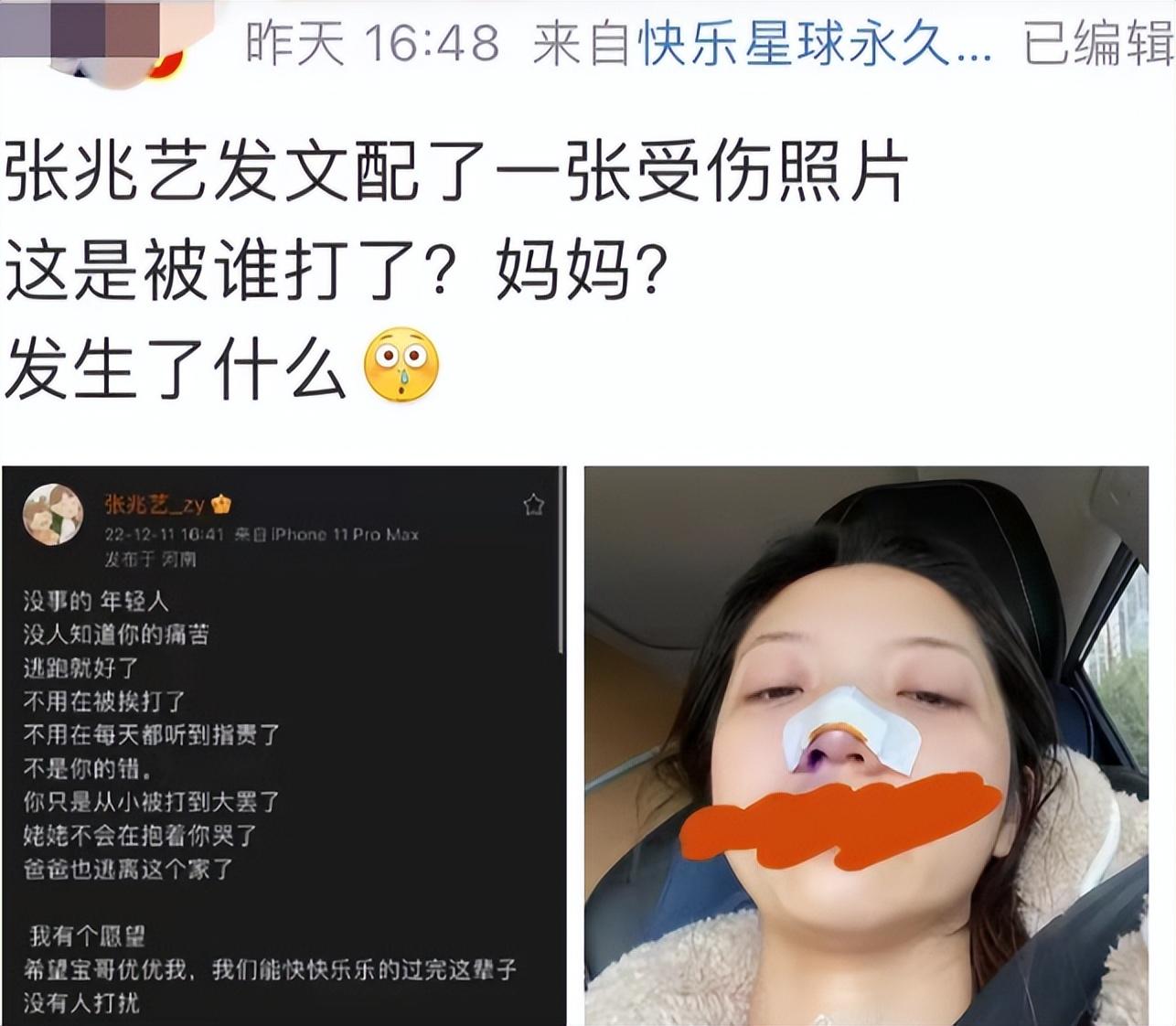 2022年张兆艺突然自曝自己遭母亲家暴的信息,一时引起舆论哗然,或是因反响很大,在发帖不久后删除,但还是被网友保存下来截图,