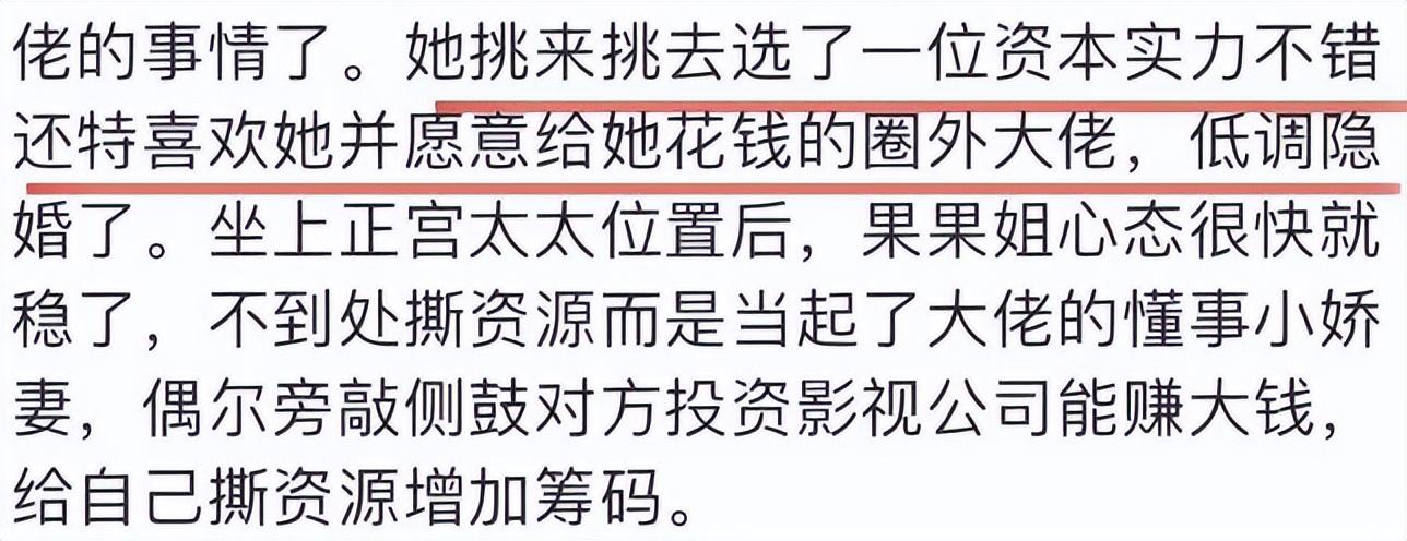 如今的果果姐低调隐婚,也是看到了同剧组女演员嫁给大佬后一帆风顺的现状,趁着没有年老色衰找个真心爱自己的还是很简单的,既能让未来有保障,还能让事业更上一层楼,何乐而不为?