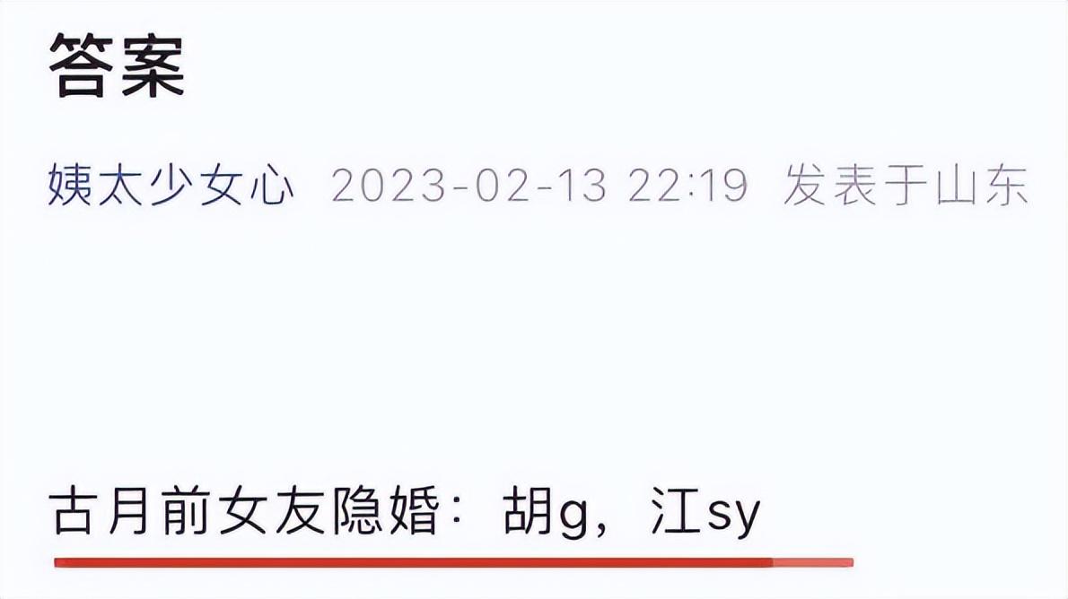 2月14日,知名大V博主“叫我姨太好了”透露情人节大瓜:古月前女友、女星赢果果姐低调隐婚!时间还比前不久官宣得子的前男友早。另一个大V博主透露主人公的名字缩写:胡g、江sy,显然是大家非常熟悉的胡歌跟江疏影两位明星。