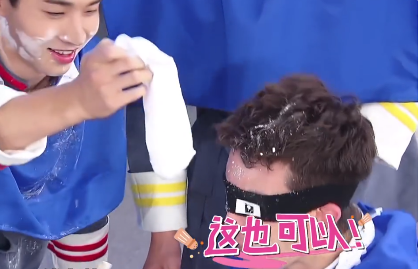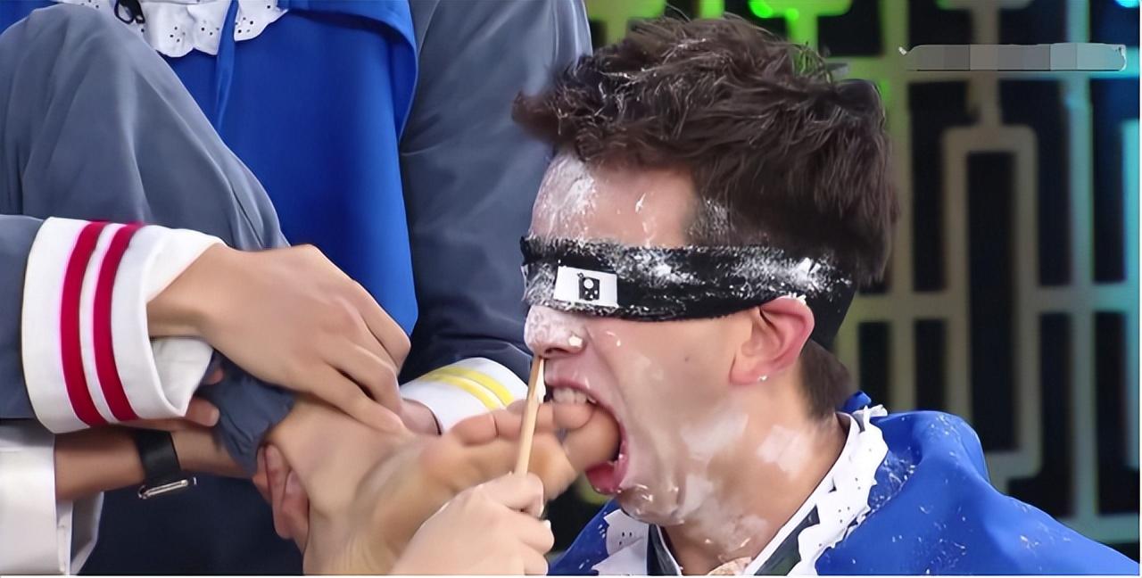 不知道越恶作剧越上瘾,最后他在身边几个嘉宾的协助下把脚趾粘上面粉塞到Mike嘴边。