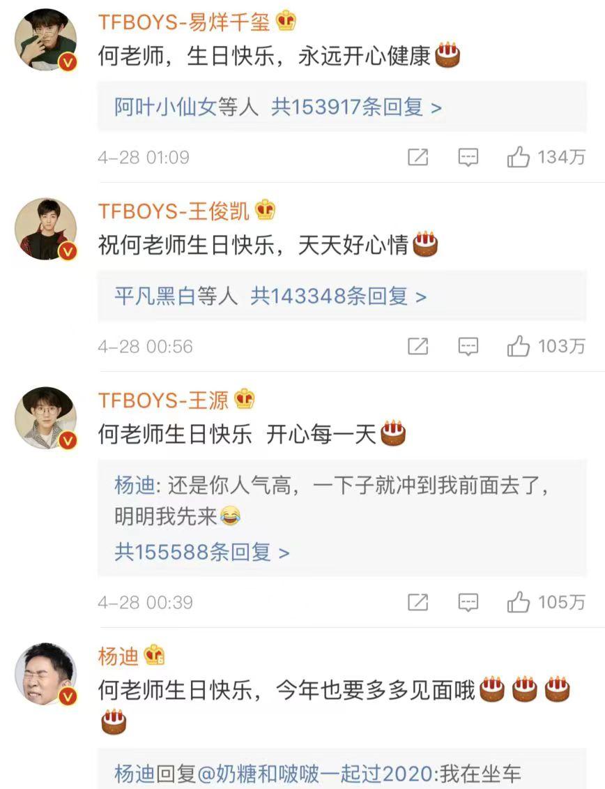 只要到了每年的4月28日,何老师微博上的评论区,就会直接炸开了锅,送祝福的明星们,是一个比一个大牌。