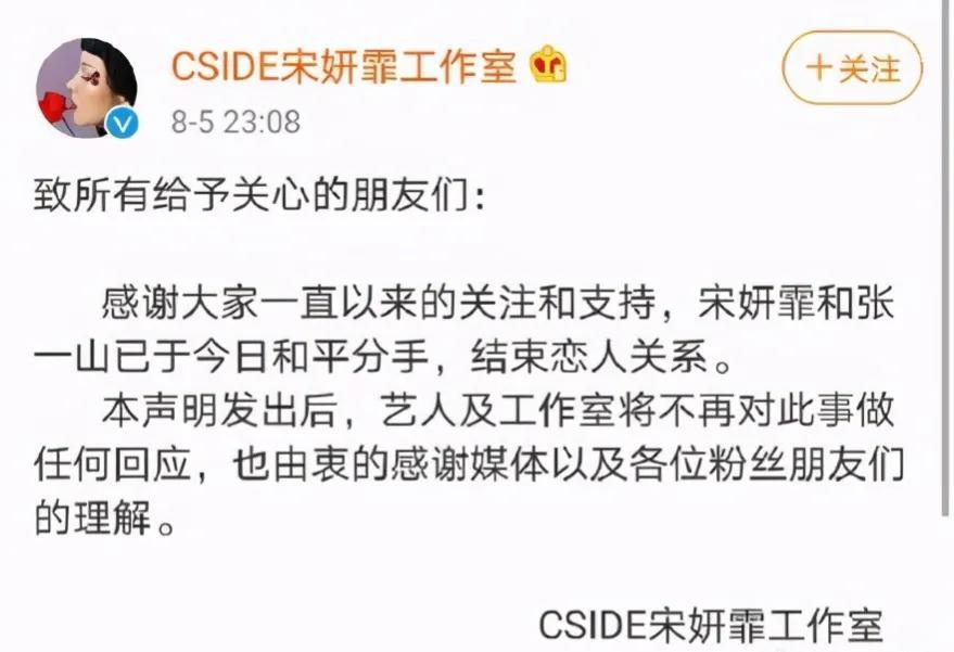 宋妍霏接下来的操作堪称神来之笔,她的工作室回应说:宋妍霏跟张一山于今日和平分手,结束恋人关系。
