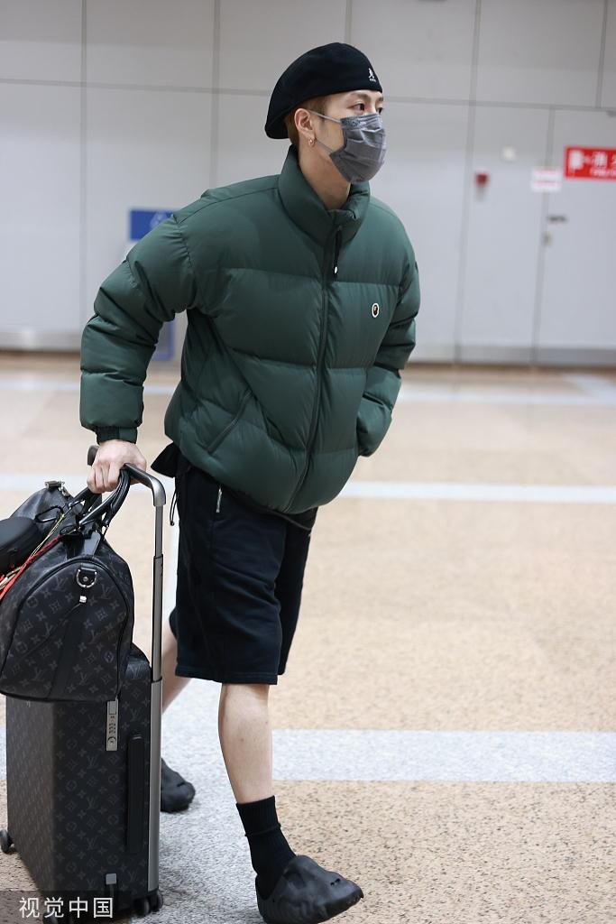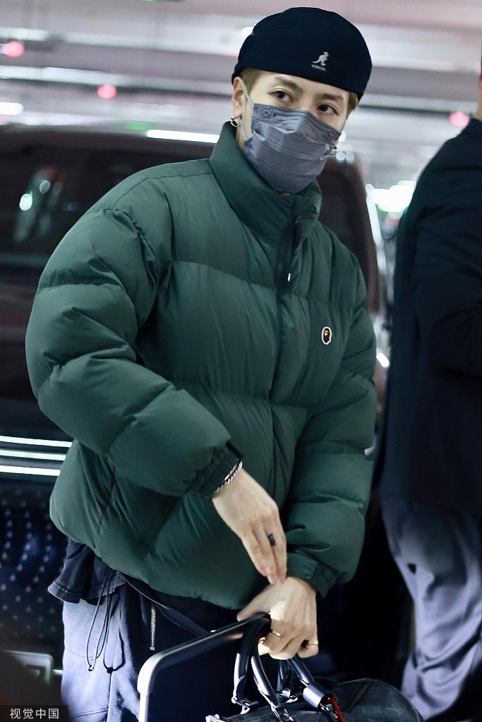 王嘉尔现身机场 身穿绿色棉袄搭配黑色短裤露出小腿