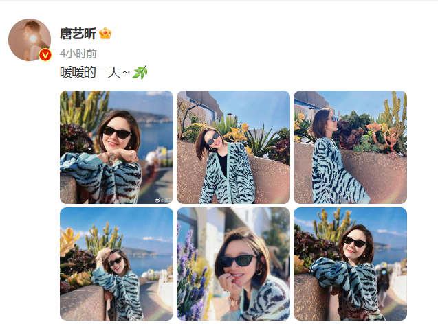 2 月 21 日,唐艺昕在社交平台上分享了六宫格户外随拍,并配文 " 暖暖的一天 "。图片中唐艺昕身穿蓝色条纹开衫,衣服上点缀着白色和蓝色的水钻,一头利落的短发搭配简约的墨镜,状态超好。海边小路上,温暖的阳光倾洒下来,好天气似乎让人的心情也变好了,唐艺昕嘴角甜甜的笑容好治愈。
