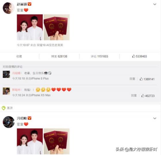 两人同时公布结婚消息,赵丽颖的评论是一百多万,冯绍峰的评论量是二十几万,两个人差了将近六倍的量级。