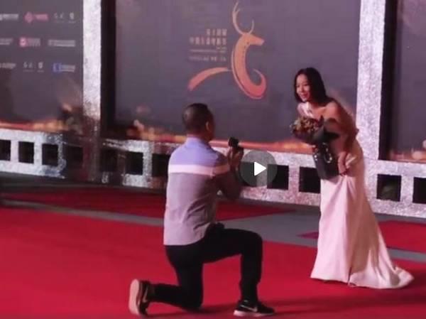 从当时拍到的视频来看,该男子冲到红毯上,手里捧着一束花,大步走到王珞丹面前,还没等王珞丹缓过神来,随即就跪在红毯上,给王珞丹献上钻戒求婚起来了。