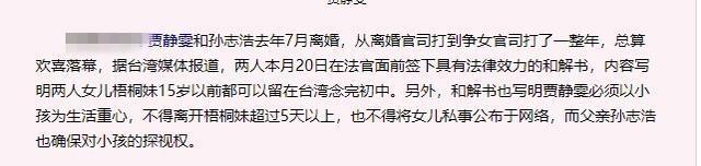 虽说贾静雯最终取得了大女儿的抚养权,但经过与孩子父亲协定:梧桐妹15岁之前必须要生活在台湾省,而且在这期间,贾静雯不得离开女儿超过5天,也不可以将女儿的私事发布在网络上。同时,孙志浩作为父亲也必须享有对女儿的探视权。