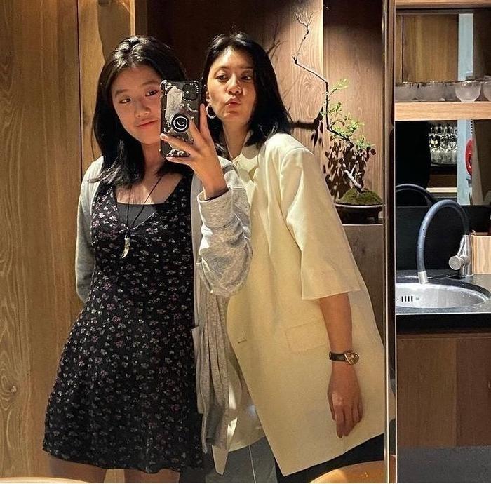 只见今年15岁的梧桐妹身穿一件黑色碎花连衣裙,与母亲贾静雯同框自拍,镜头下的一对母女虽然打扮较为随意,但魅丽却丝毫不减,一眼看过去,两人就如同姐妹一般。