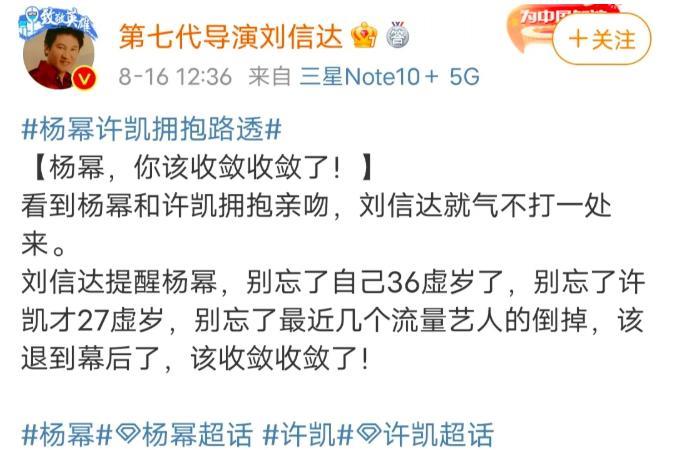 无论是和魏大勋还是和杨洋甚至是现在的许凯,男主角无一不是小鲜肉,而面对杨幂现在的这种状态,娱乐圈的非著名导演刘信达直接炮轰杨幂,微博发文嘲讽杨幂老牛吃嫩草,已经是孩子妈妈的杨幂要知道自己的身份,既然已经站到了事业的巅峰就应该退居幕后。