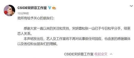 在张一山爆出丑闻后,宋妍霏工作室随即发表和平分手声明。毫无疑问,二人之前的确实是情侣关系。如此一来,就坐实了张一山渣男的形象。