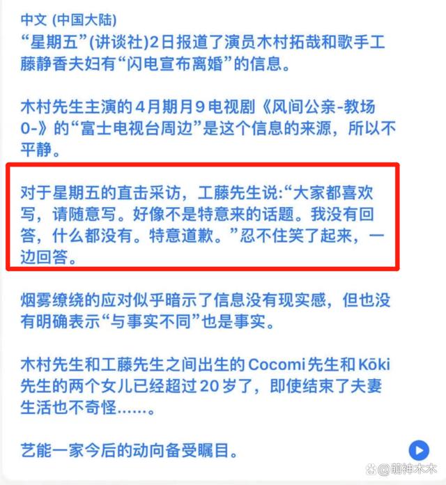 工藤静香这番回应没有直接否认离婚传言,似乎并不在意,但是她也没有具体回应两人的关系是否有变化,还向大家道歉。