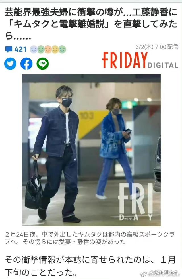 根据日媒报道,木村拓哉与工藤静香闪电离婚,目前木村拓哉和工藤静香均未对此作出回应。日媒还在报道中指出,木村拓哉疑似出轨有了情妇,而且夫妻两人已经很久没有同框了。