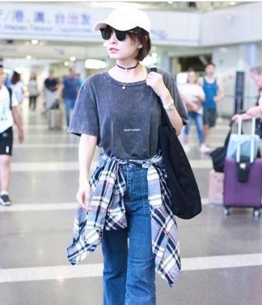 前面我们有提到过,这种不好好穿衣服的风格在今年更是流行。上身一件圆领的T恤,下身搭配一条深蓝色的高腰阔腿牛仔裤,腰部绑上一件格子款的衬衣,非常随性且中性风的搭配,时尚感非常的强。
