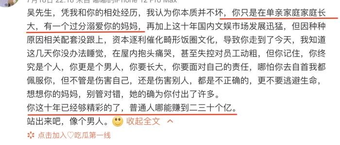 因为在单亲家庭长大,吴亦凡的母亲非常溺爱他,导致他现在性格有缺陷。这一点都美竹曾在自己社交平台上写出,看得出来都美竹一开始并不想与吴亦凡翻脸。