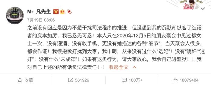 至今吴亦凡及其公关团队的态度是:所有女性曝光的黑料都是假信息,自己是无辜的。