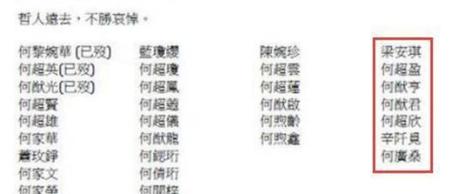 不过细看其他房的名单,好像三房何猷启的妻子齐娇也不在列,两个女儿却出现了;四房何超盈的老公辛奇隆也不在名单中。同样,奚梦瑶的儿子何广燊在列,奚梦瑶也同样不在列。