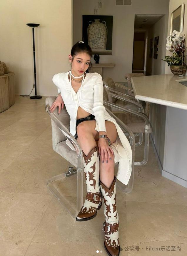 韩国独立设计师品牌RECTO的针织衫,搭配西部牛仔式靴子,颇有自己的风格。