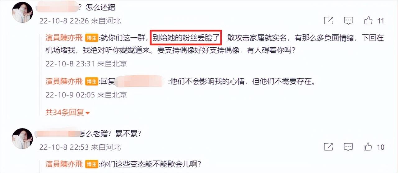 有不少女方粉丝跑来留言“怎么老蹭(热度),累不累”?暗指陈亦飞蹭妻子热度,气得他怒怼“你们这些BT能不能歇会儿啊”?直言“别给她的粉丝丢脸了,敢攻击家属就实名”!