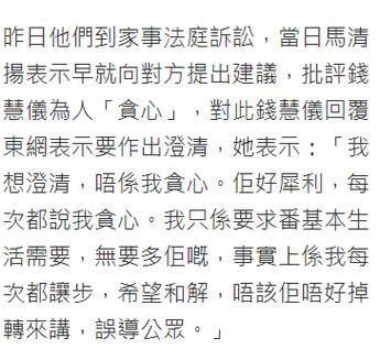在长达六年的离婚官司中,钱慧仪和马清扬之间的关系变得剑拔弩张。马清扬多次对外声称钱慧仪不满目前每月48万的生活费,甚至认为她贪心。作为回应,钱慧仪在采访中澄清道:“我想强调的不是贪心,而是我正当的基本生活需求。”她的这一表态不仅让人们开始反思“基本生活需求”究竟是什么,更引起了社会对于金钱与价值的重新审视。