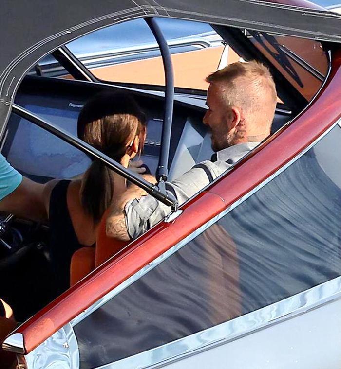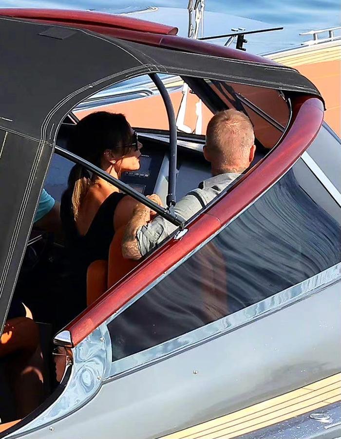 贝克汉姆一家外出游玩,小儿子和女友坐在船尾亲亲,对面坐着小七